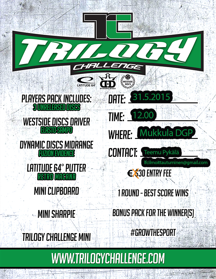 Trilogy Challenge -kilpailu perustuu siihen, että jokainen hankkii osallistumisellaan pelaajapaketin, mikä sisältää kolme erilaista kiekkoa. Kiekkoihin kuuluu 1 putteri, 1 midari ja 1 draiveri. Pelkästään näillä kiekoilla pelataan yksi kierros Mukkula DiscGolfParkissa ja lajin normaaleilla säännöillä sarjassa vähiten heittänyt korjaa potin. Mukkulan radalle tehdään erikoisväyliä kilpailun ajaksi. Lisätietoja kilpailusta: http://trilogychallenge.com/